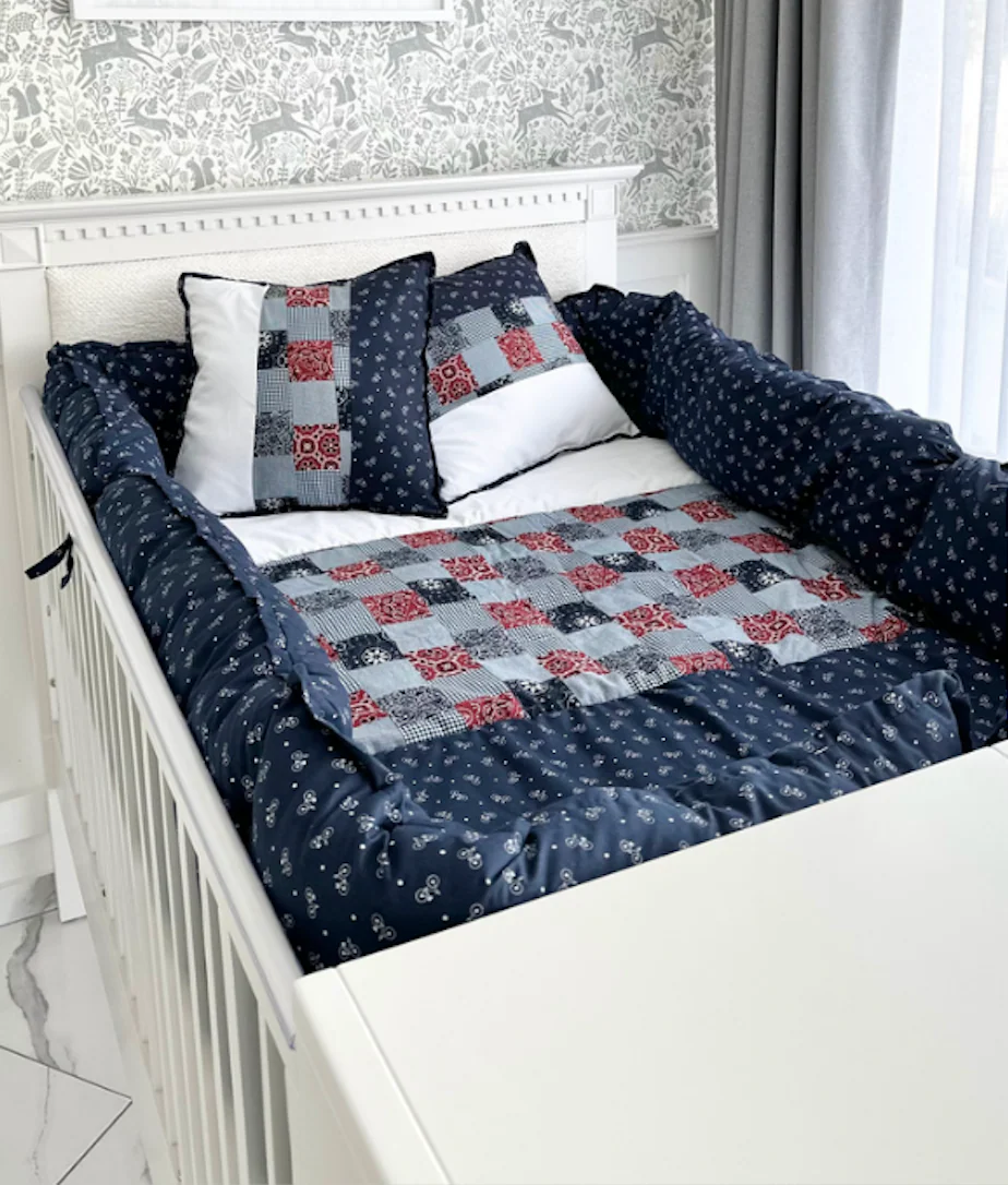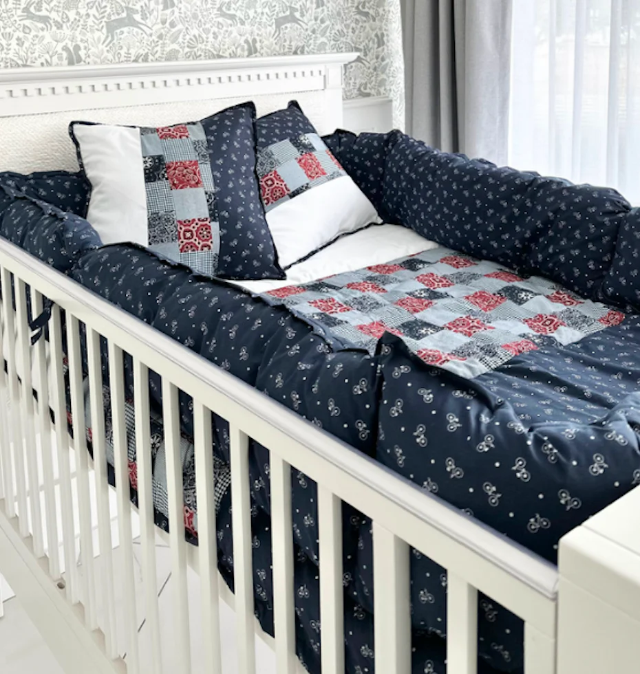 Incluye 2 cojines, edredón y bumper que se puede amarrar a la cuna.